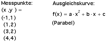 Als Beispiel sind unten 4 Messpunkte vorgegeben, und die Ausgleichskurve soll eine Parabel sein, die von drei Parametern a, b und c abhängt.
